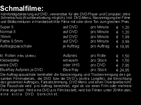 Sie zahlen eine einmale Auftragspauschale von € 19.95 für: die DVD, Einrichtung, Reinigung der Filme und eventuellen Versand, egal wieviele Spulen Sie abgeben, ob es eine ist oder mehrere. und dann nur noch € 1.99 pro Minute ! Auch wir wissen, dass dieser Preis gegenüber anderen Überspielserviven sehr günstig ist, die meistens ab € 3,50 pro Minute anfangen und meistens noch mehr verlangen. Bei uns erhalten Sie aber deshalb keine minderwertige oder schlechte Qualität, wir zählen zu den besten Film Digitalisiern in Europa. Seit Jahren beschäftigen wir uns schon mit dem Thema Schmalfilm und Digitalisierung. Extras die Sie woanders auch extra bezahlen müssen sind bei uns im Preis schon inklusive: - Filmreinigung vor und während dem digitalisieren - Antistatisch und Naßreinigung der Filme - DVD im echten DVD Format, keine Avi oder MPEG1 - DVD´S sind nicht schreibgeschützt und können kopiert oder im PC weiterverarbeitet oder geschnitten werden. - DVD Menue inklusive, jede Filmrolle erhält Ihren Namen - DVD abspielbar in allen DVD Playern und am PC - Kein Aufpreis für mit oder ohne Ton, mono oder Stereo inkl. - bei mitgelieferter Musik (CD oder MC) überspielen wir diese auch zu dem Film mit auf DVD.